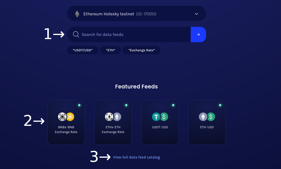 On the network page, you will see a search bar (1), some of the data feeds that are already active on the network under "Featured Feeds" (2), and a link to the catalog (3).